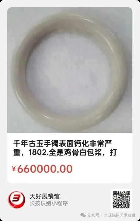 千年古玉手镯表面钙化非常严重,全是鸡骨白包桨,打灯看是黄口白料,看起来非常美观,是一件值得收藏的精品宝贝,口经59是10毫米的圆条,重42.3克。注~我个人知道是正品。来源1802.
