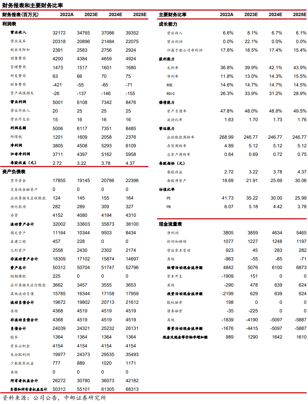 公司开源节流、提质增效精细化管理,叠加外部有利环境催化,同时公司线上线下并举助力品牌势能进一步提升,中高端产品规模有望进一步扩大,公司高质量发展可期。我们预计2023-25年归母净利润分别为43.97/51.62/59.58亿元,对应23-25年EPS分别为3.22/3.78/4.37元,对应当前股价PE为35/30/26倍,考虑到公司产品结构升级有望加速,给予23年40倍PE,对应目标价为129元,首次覆盖给予“买入”评级。