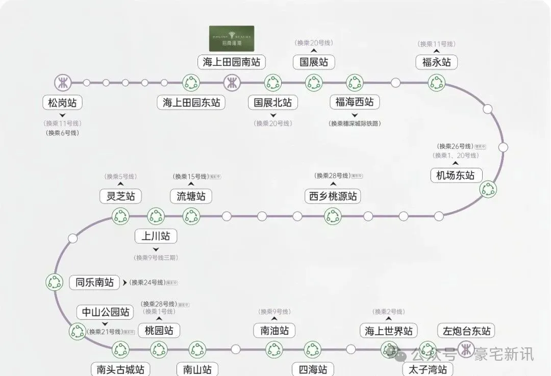从项目出发,直线距离12号线海上田园南站A出口约100米,1站到国展北可换乘20号线,5站到福永可换乘11号地铁线。