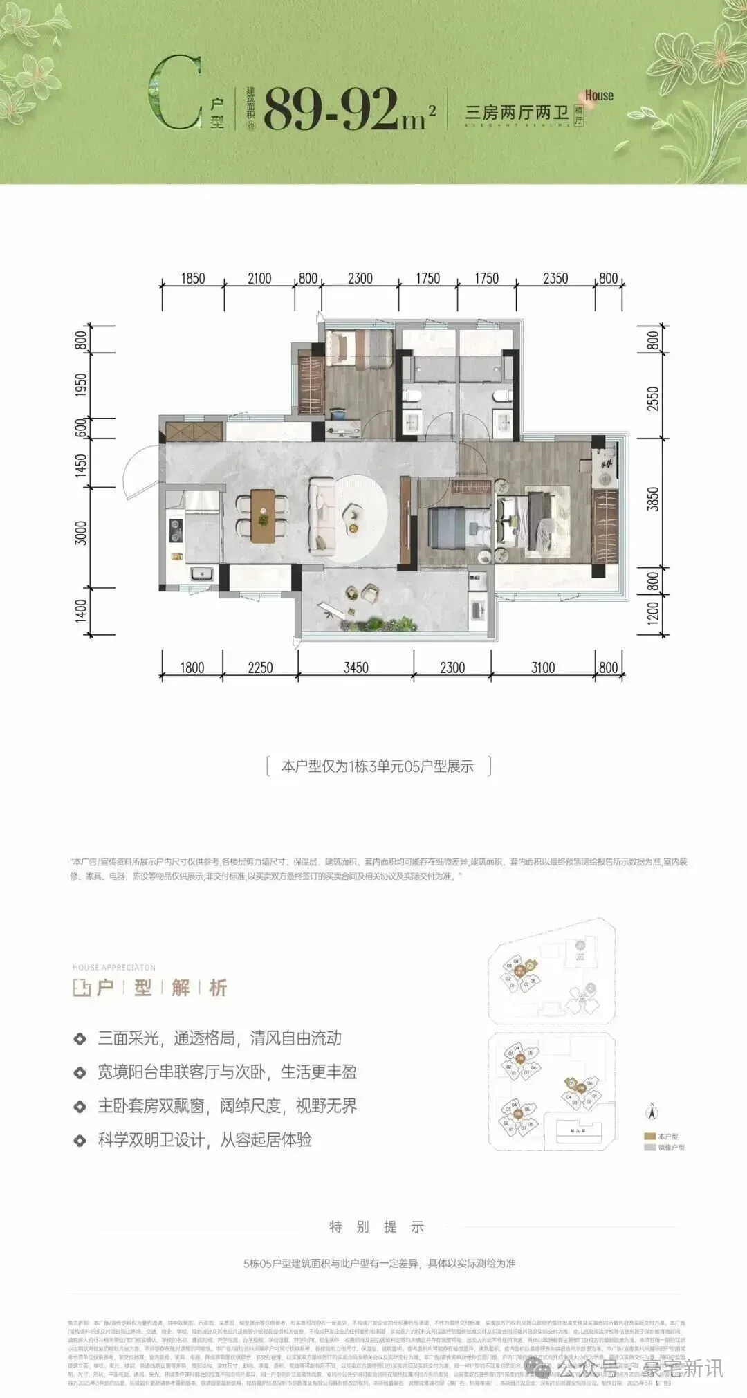 招商会展湾雍境名邸位于宝安沙井大前海会展湾片区的招商会展湾雍境名邸,本次是招商会展湾雍境二期,首推1栋3单元的195套房源,面积段有80㎡3房1卫,91㎡3房2卫,92㎡3房2卫3种户型,是3梯7户的普通高层,预计2027年9月精装交楼。