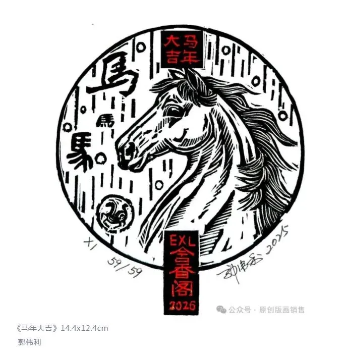 【线上展览】河北省美术家协会版画艺委会马年献瑞一2026马年贺新春生肖版画展。郭伟利藏书票《马年大吉》入展。河北省美术家协会版画艺委会。