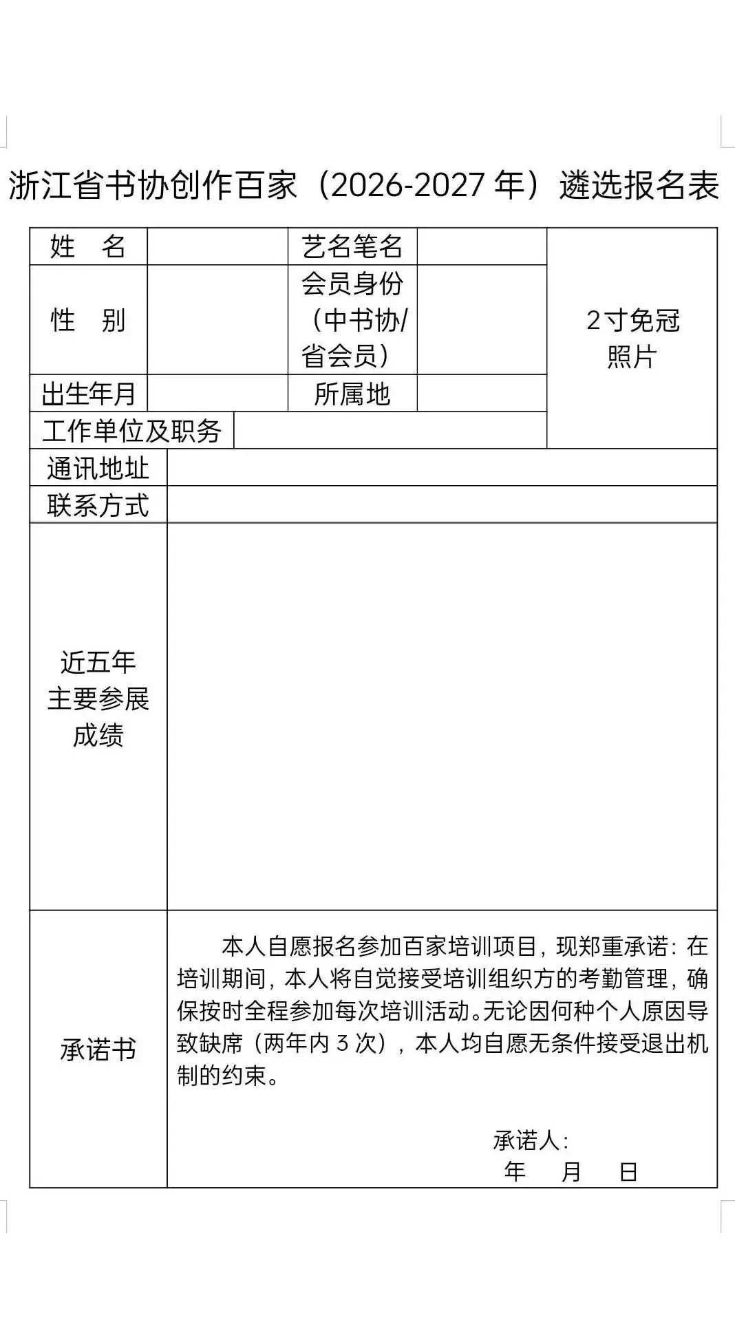 浙江省书协创作百家(2026-2027年)遴选报名表