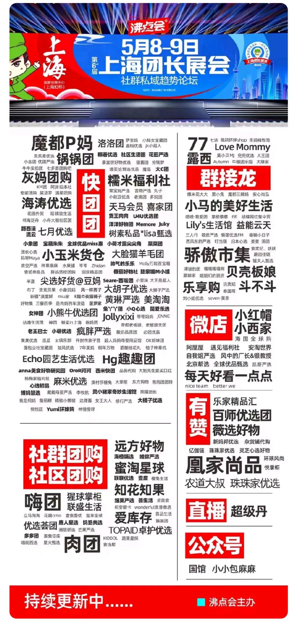 魔都p妈 、HG趣趣团 、海涛优选 、糯米福利社 、灰妈团购 、锅锅团 、小玉米货仓 、货王肉肉 、U4U优选团 、帅气的乐乐 、西米快团 、洋洋好物团 、Memore 、瑶哥 、心选初品 、Juky 、Yumi环球购 、番茄好物社 、小象团 、OroR珂珂 、小小蜜 、臻选团优品 、流云 、洛洛团 、菜菜团 、Seare·西啦团 、路西法 、Echo园艺生活优选 、女神团 、兔丫丫团 、小荷才露尖尖角 、老张外贸 、小Q心选 、十亿好物 、快快高品质团 、苏苏高品质 、老王巴士 、陆家嘴M小姐 、天马会员 、尖选好货@豆妈 、毛毛北海道 、简爱乐选 、anna美食好物研究园 、小萌优选 、粮著优选 、大脸猫羊毛团 、博妈慧选 、宝藏朱朱 、小熊牛优选团 、社区生活圈 、小蓓心选团购 、大橘子优选 、疯胖严选 、大胡子优选 、七月优选 、花田严选 、大C团 、树素私品*lisa甄选 、熊猫团 、黄琳严选 、77团团转 、Jollyxixi 、美淘淘 、灵小猪家奇妙生活馆 、喜家团 、麻米优选 、全球优品miss惠&小西家