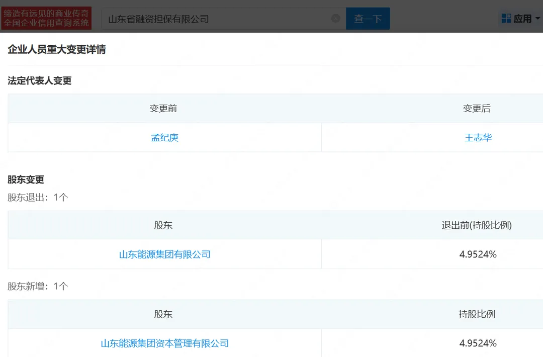 企查查显示,日前,山东能源集团有限公司(下称“山东能源集团”)退出山东省融资担保有限公司(下称“山东融担”),退出前持股比例为4.95%。该部分股权由山东能源集团旗下全资子公司山东能源集团资本管理有限公司(下称“山能资本”)“接手”。