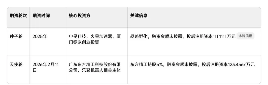 4. 2026年2月11日:完成天使轮融资,引入东方精工、乐聚机器人等产业投资方,投后注册资本变更为123.4567万元;同期正快速搭建量产产线,推进批量交付能力建设。