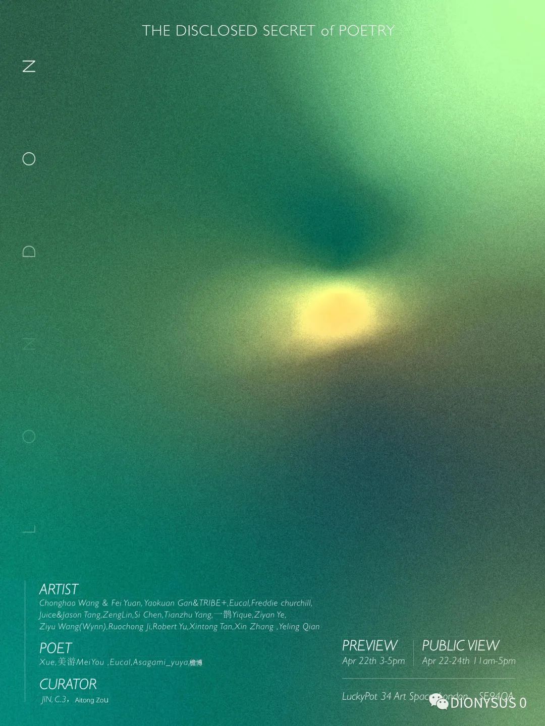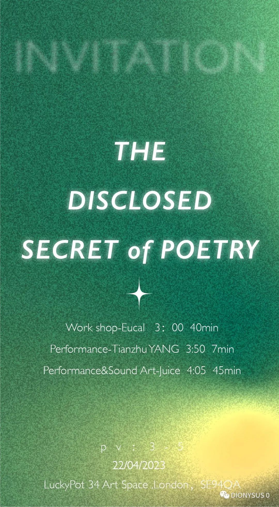The disclosed secret of poetry 是由策展人JIN与C.3发起的独立策展项目,将于2023年4月22日至24日在位于东伦敦的艺术画廊LuckyPot 34 Art Space 举行,本展览邀请了13位活跃在国际当代艺术领域的艺术家与4位诗人,作品形式包括;行为,装置,影像,诗歌。本次展览的叙事分为纸上的诗与纸下的诗,意在探讨诗与艺术的关联性,艺术家与策展人将内心的意向诗境化所创作的诗意的场域注意感知,体验。