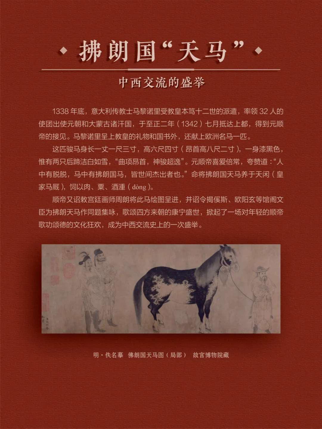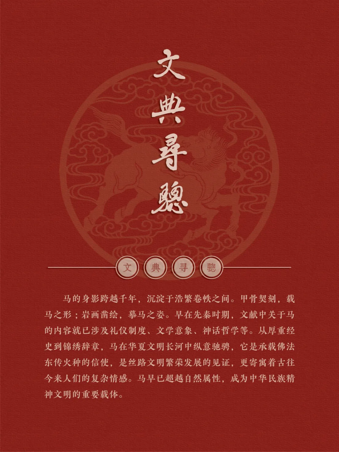 马蹄声穿越岁末,驮着春意踏入人间。本次云展览铺展马文化的历史长卷——从仪仗威仪到农耕功勋,从典籍追光到丹青留影,每一匹骏马都驮着团圆与祥瑞的寓意,蹄印踏过千年,仍在新春的门楣上扬起尘烟。