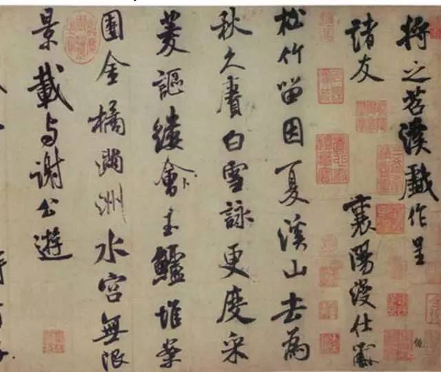 《苕溪诗》卷 (北宋 )米芾,故宫博物院藏。《宋米芾苕溪诗帖》,北宋,米芾书,纸本,行书,纵30.3cm,横189.5cm。为宋元佑三年(1088)八月八日米芾书自撰诗。共35行,294字,此为米芾三十八岁时所书。铃有“绍兴”“睿思殿印”“项元汴印”“乾隆御览之宝”“嘉庆御览之宝”“宣统御览之宝”等鉴藏宝印。帖首行下有项氏收藏之“独”字编号,帖后有米友仁,李东阳跋。