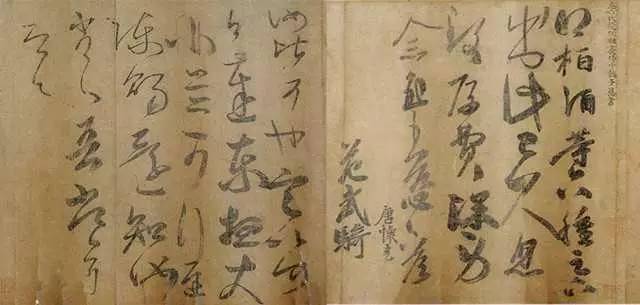 《苦笋帖》卷 (唐)怀素,上海博物馆藏。怀素《苦笋帖》,绢本墨迹,两行十四字。书法俊健,墨彩如新,直逼二王书风,是怀素传世书迹中的精彩之笔。清吴其贞《书画记》评:“书法秀健,结构舒畅,为素师超妙入神之书。”苦笋与茶的性状,同佛道中人有许多相通的地方,怀素通过书法充分体现了茶与禅的种种缘分。