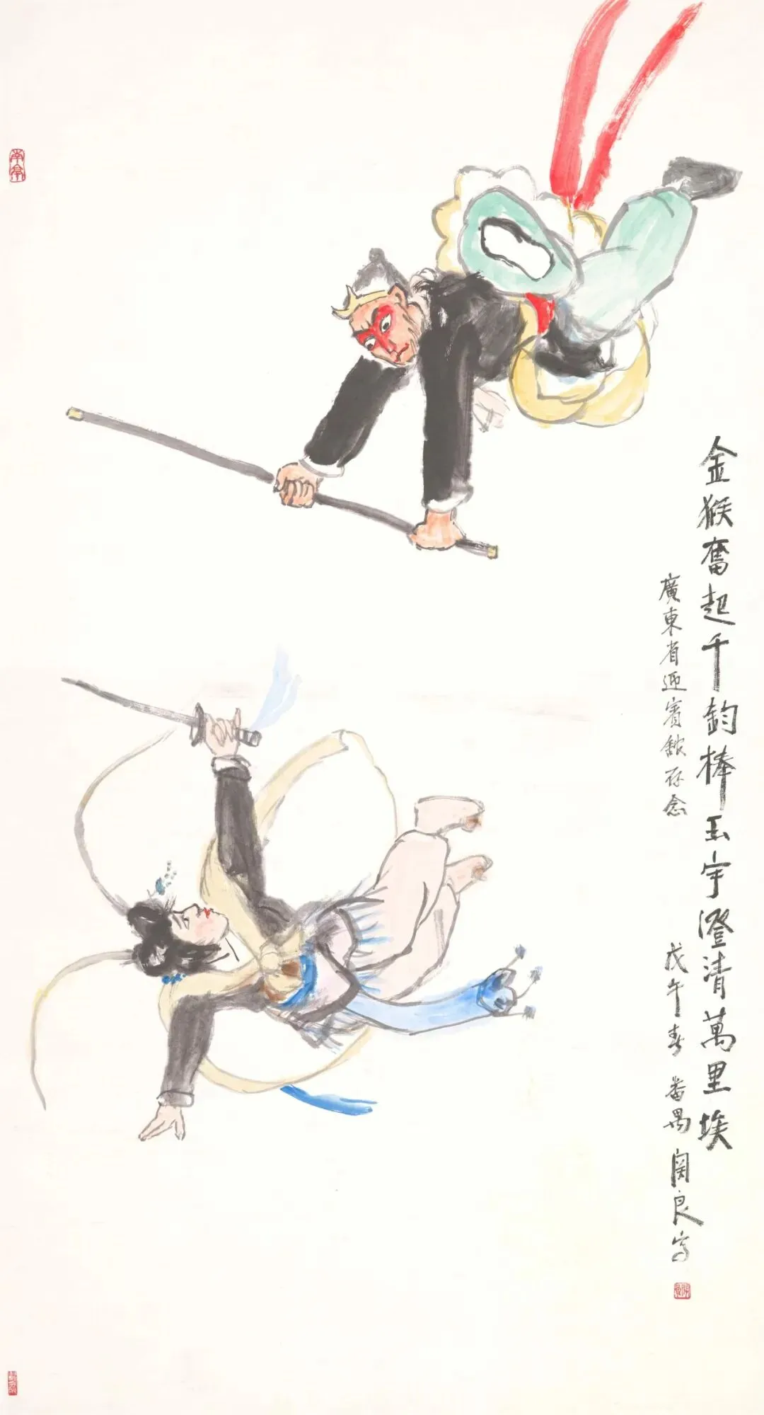 关良自小就喜欢看戏,创作了大量“戏曲画”作品。在《三打白骨精》中,关良精准地抓住了孙悟空举棒奋起,白骨精跌倒抬剑欲挡的瞬间,人物神态生动,晕染质朴,极富生趣。作品没有拘泥于对象的解剖、透视和比例,而是以夸张、变形的手法,将打斗的戏剧效果刻画得栩栩如生。在细节的处理上,关良充分利用人物脸谱的色彩和造型,面部处理大胆生辣,线条恣意勃发,造型夸张,用色饱满,可以看出艺术家受西方表现主义的影响。作品采用“对角”式构图,利用点、线、笔触、色块等元素形成一条显性或隐性的对角线,使画面形成一种奇险之势,再以笔墨和色彩调和画面,从而达到了一种视觉平衡的效果。整幅画作看似儿童画般稚拙,却透出一种凝滞、舒缓、力透纸背又不失洒脱的用笔功力,体现了一种内敛中和、深沉朴茂的审美意味。