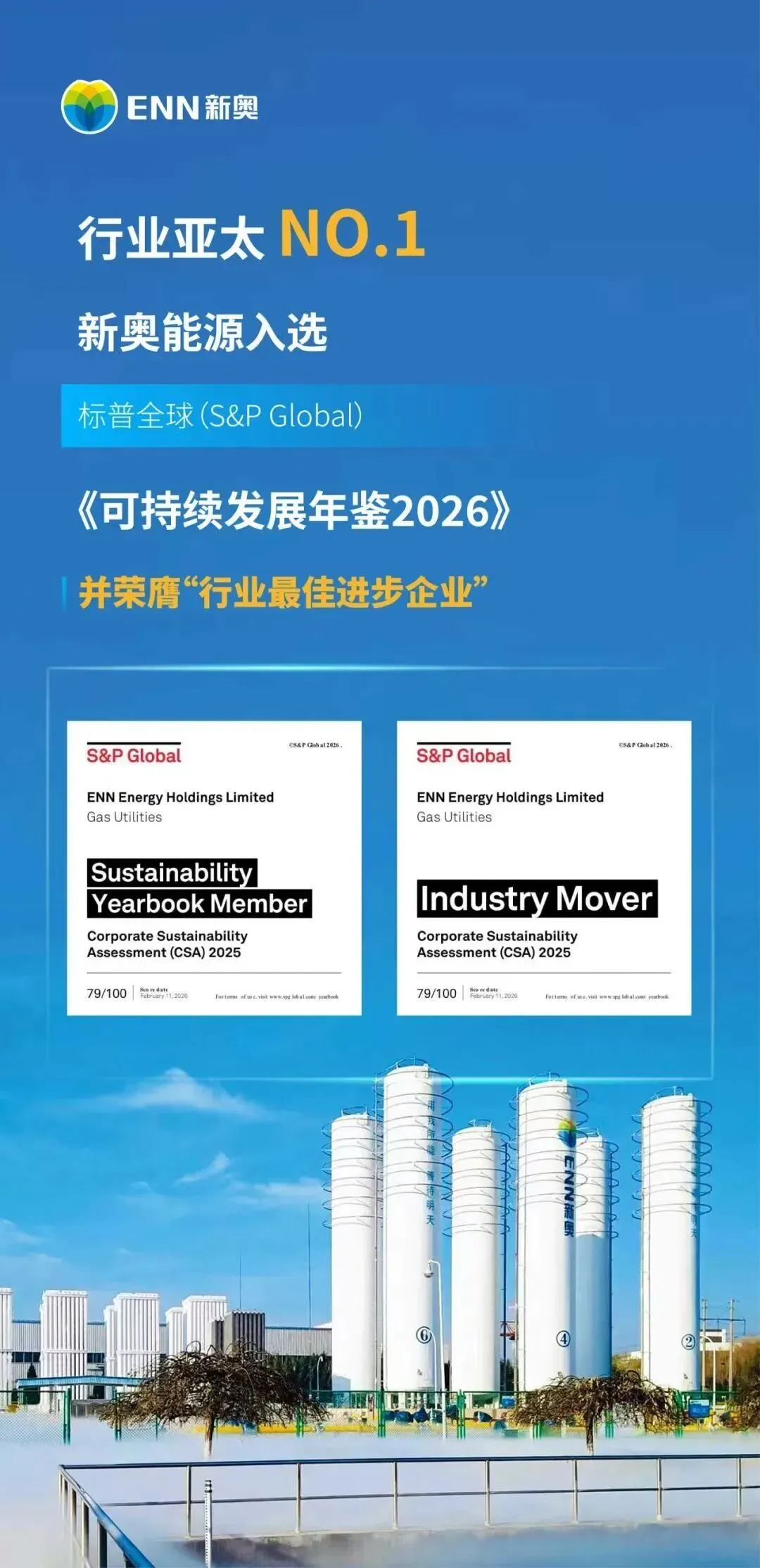 近日,全球最具影响力的可持续发展评估之一——标普全球企业可持续发展评估结果正式公布。新奥能源(股票代码:02688.HK)凭借在环境、社会及公司治理(ESG)方面的卓越表现,以79分的优异成绩位居天然气公共事业行业亚太区榜首、全球第五,成功入选标普全球《可持续发展年鉴(2026)》,并荣膺行业最佳进步企业,标志着公司的可持续发展实践已达到国际领先水平。