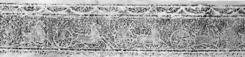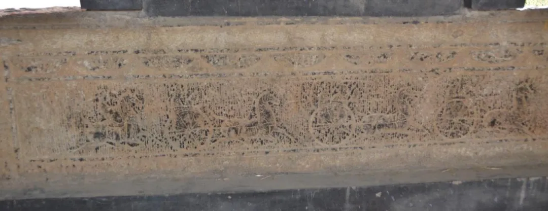 画面上方用两条横栏装饰,横栏内有垂帐纹。画面的核心是三辆轺车居中迤逦而行,每辆轺车中,正襟危坐着峨冠博带的官吏,虽面目简括,但姿态却显从容庄重。真正引人注目的是牵引车辆的骏马,它们脖颈昂扬,四肢开张,肌肉线条充满张力,仿佛能听到其踏地铿锵的节奏,雕刻者甚至未放过最精微的细节——马缰绳的垂拂、鞍鞯上的纹饰,皆清晰可辨。车队前后,各有一名骑吏护卫,这简单的“前呼后拥”布局,构成了一个完整、封闭且秩序井然的礼仪空间。整个画面虽静止于石上,却通过流畅的线条、人物车马前倾的动势,营造出一往无前的行进感。这并非简单的旅途记录,而是一套深刻的时代符号——石上乾坤的帝国气象。