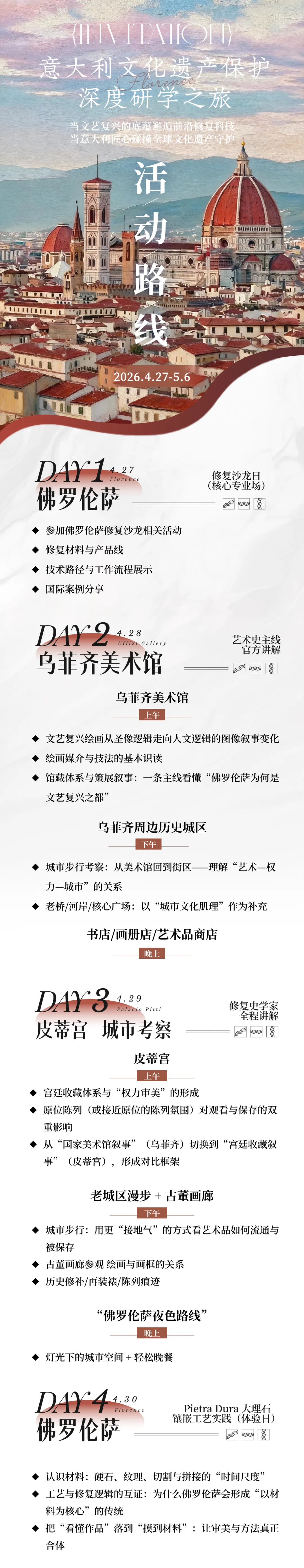 意大利文化遗产保护深度研学之旅:配备专人陪同,深入参观佛罗伦萨及周边知名美术馆、博物馆。活动参团人数需满足三人成行,上限为六人。若报名人数不足三人无法成团。如报名人数超过六人,我们将与意大利合作方积极协商,在确保接待质量与服务标准的前提下,适度增加名额。研学活动自4月27日至5月6日,具体活动安排如下: