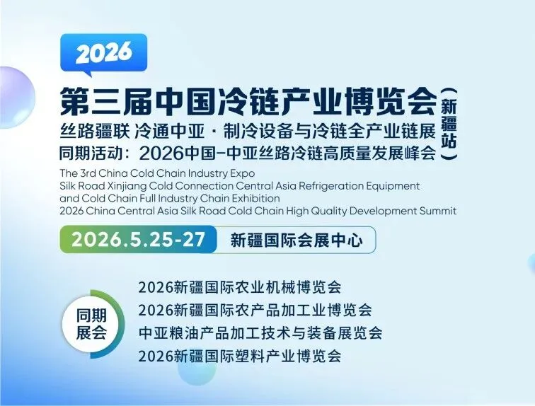 自成都、昆明成功举办两届以来,CCE中国冷链产业博览会已成为行业极具影响力的专业展会之一。2026年,展会循丝路而来、重磅落地新疆乌鲁木齐,为紧抓国家战略机遇,立足新疆产业优势,畅通丝路冷链通道,助力中国—中亚产业合作,由西部制冷展组委会、重庆世展展览有限公司、冷暖朋友(重庆)会展有限公司主办的第三届中国冷链产业博览会(新疆站),将于2026年5月25日—27日在新疆国际会展中心隆重举办。