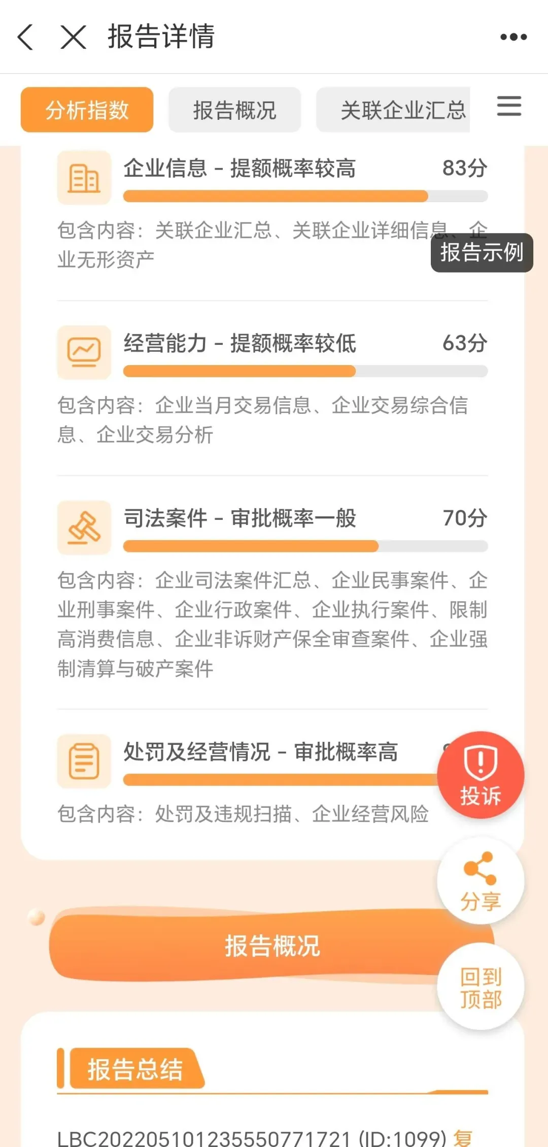 报告内容包含了:基本信息、异常名单、失信案件、执行案件、限高消费、具体非银机构网贷、申请次数、笔数等等68项概况。如图