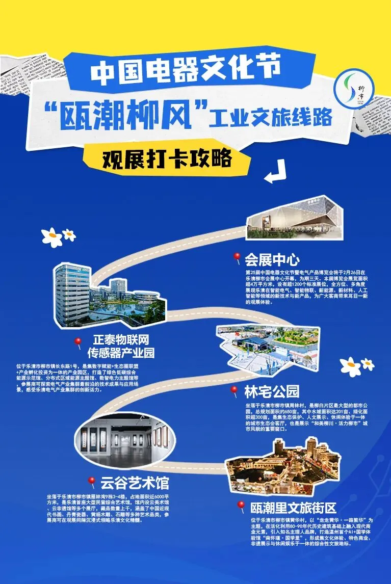 这条特色线路以柳市会展中心为起点,沿途串联正泰物联网 传感器产业园、林宅公园、云谷艺术馆、瓯潮里文旅街区等柳市 电气产业地标及文旅地标,形成“产业科技+园林休闲+非遗艺术+ 潮流文旅”的特色游览线路。
