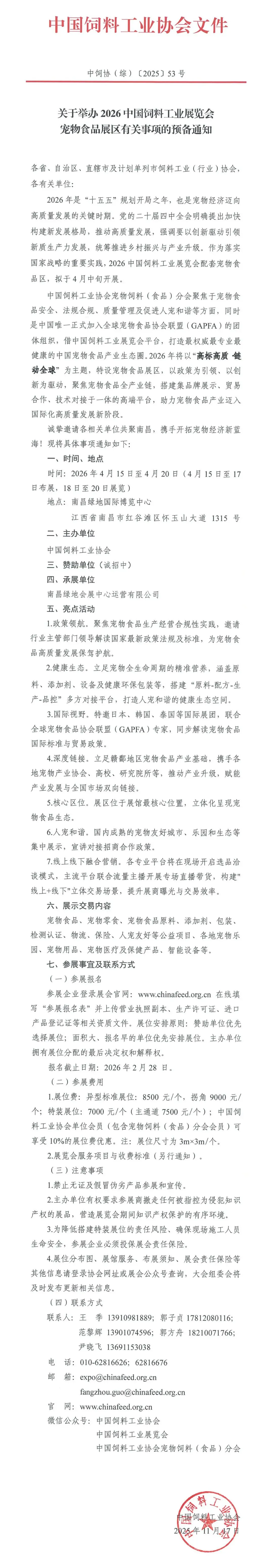 关于举办2026中国饲料工业展览会宠物食品展区有关事项的预备通知