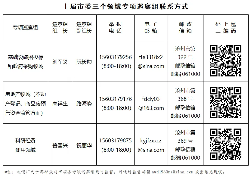 市委专项巡察组将在被巡察单位现场巡察75天左右。巡察期间设举报电话、邮政信箱、电子邮箱和反映问题情况的“码上巡”二维码,受理信访截止时间为6月9日。根据有关规定,巡察组主要受理反映党员领导干部在基础设施招投标和政府采购领域、房地产领域(不动产登记、商品房预售资金监管方面)、科研经费使用领域中涉嫌违规违纪违法问题线索,其他不属于巡察受理范围的信访问题,将按规定移交被巡察单位和有关部门认真处理。