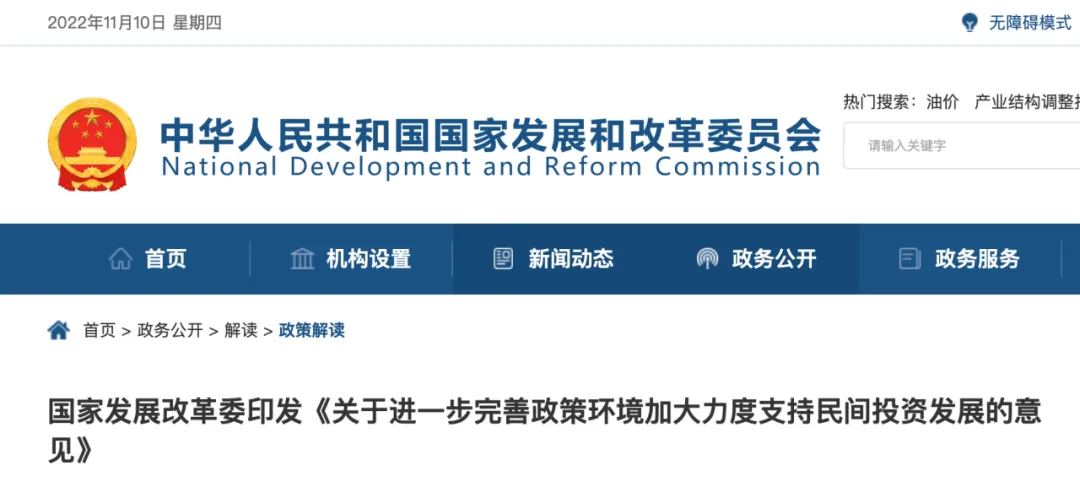 11月7日,国家发展改革委印发《关于进一步完善政策环境加大力度支持民间投资发展的意见》(发改投资〔2022〕1652号,以下简称《意见》),《意见》明确: