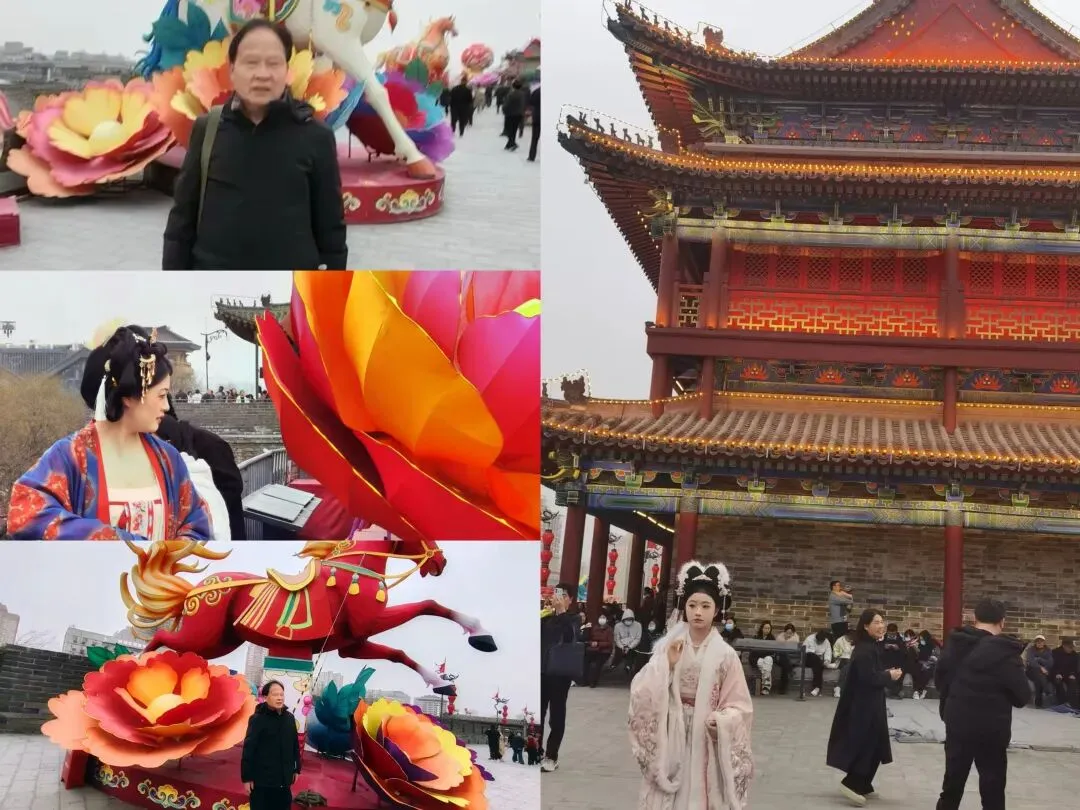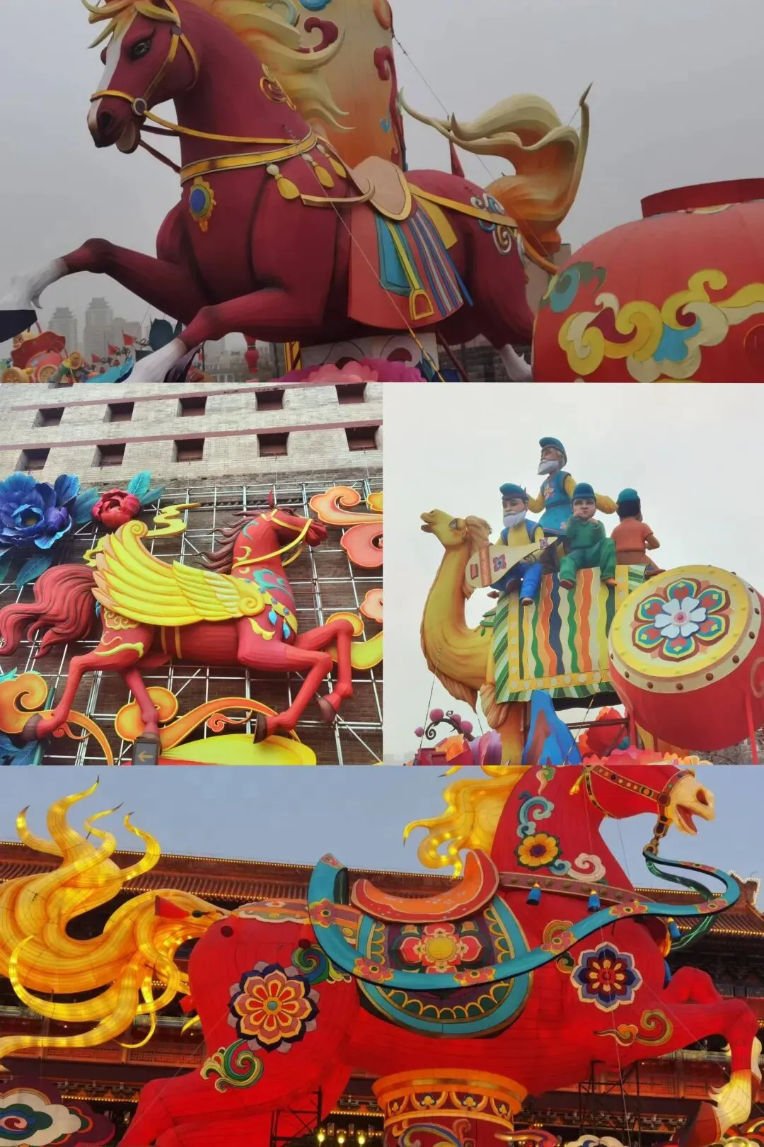 跃过护城河,进入翁城,没有阴森感觉,而是人流如潮,井然有序的沿台阶上去。恰好遇到身披铠甲,手持宝剑古装巡逻队,夜幕降临,华灯初上,城搂装扮得流光溢彩,金碧辉煌,永宁门城楼东西两边,骏马奔驰动物肖像,花灯栩栩如生,荷花花灯造型千姿百态,惟妙惟肖。2026年骏马奔驰造型设计让人惊叹,大气磅礴。此马只应天上有,人间难得一回看。昭陵六骏造型,在逼真的牡丹花丛中蝴蝶展翅飞翔,按照鎏金舞马衔杯纹银壶造型马,展示了盛唐梦幻,让人感叹。唐三彩骆驼背上胡人悠然自得,呈现出盛世气象。惟有牡丹真国色,花开时节动帝城。身着唐装的美女拍照留念,寻找梦回大唐的感觉。