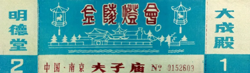 该门票横版,彩色套印,左右分别写着明德堂、大成殿,这里正是灯会的展览地,双副券样式。我估计是因为空间有限,观灯游客又多,为了维护安全限流,每处只能欣赏一次,看哪边撕哪边。正券中间是红色金陵灯会四个大字,红色代表喜庆。中间魁光阁、夫子庙大成殿、青砖马头墙和波光粼粼的秦淮河水相印。两边上角分别是两个传统花灯样式,代表金陵灯彩。最有特色的是该票没有标明具体年份,