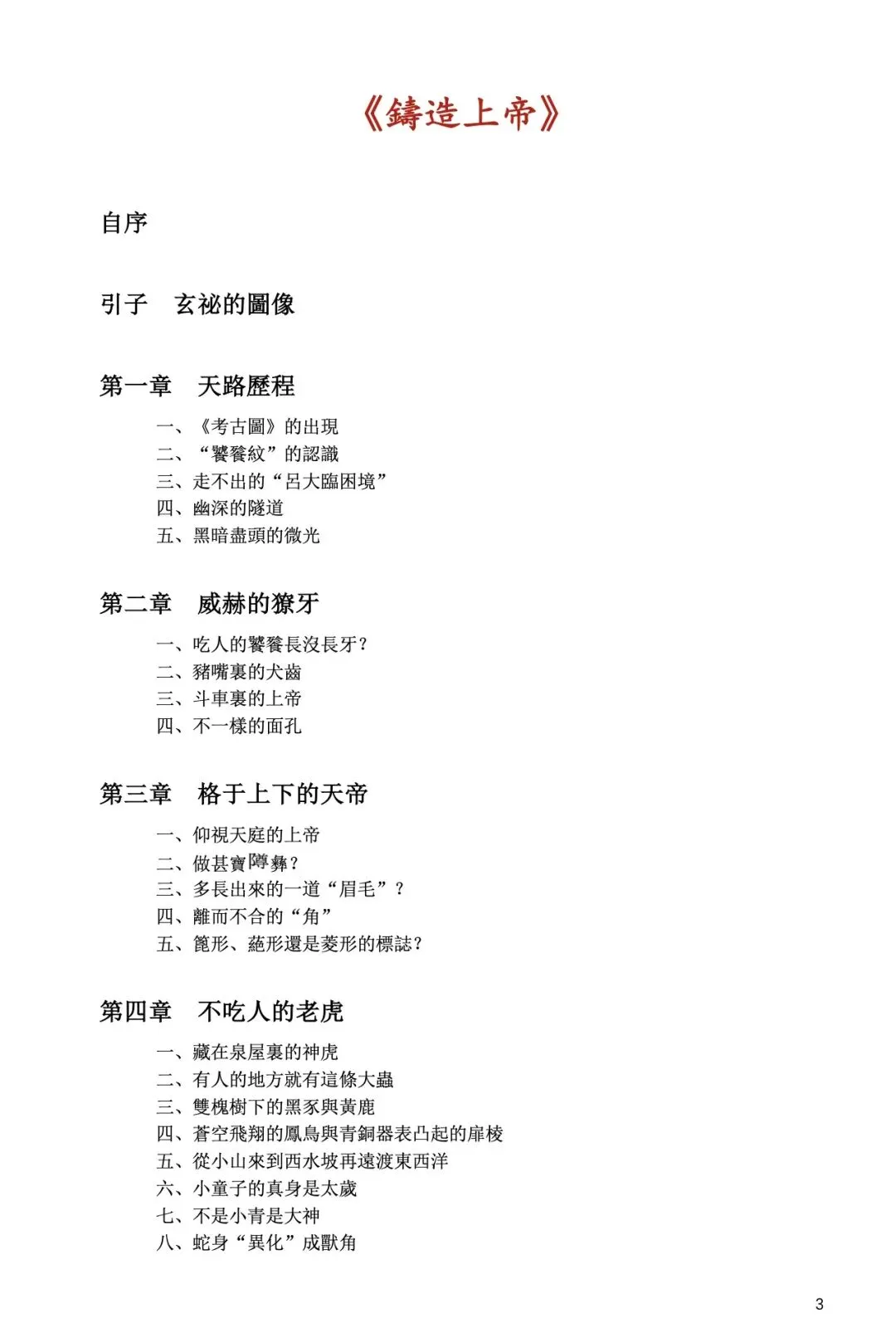 現在出版的這部《鑄造上帝》,可以說是《天曆探原》的姊妹篇,這部書也同樣繼承了《天曆探原》上述旨趣。我自信,這部書是北宋中期以來商周青銅器紋飾研究的一部劃時代著述,無疑開闢了一個新的時代;同時,這部書也將是中華文明研究史上的一部劃時代著述,因爲它第一次清楚地向世人展示了華夏文明核心要素的真實形態。儘管在今天的學術環境下,這些重大發現不大可能得到所謂“學術共同體”的認可,但作爲一個特立獨行而絕不拜碼頭、絕不搞圈子的學人,我還是爲此自豪,爲此驕傲。
