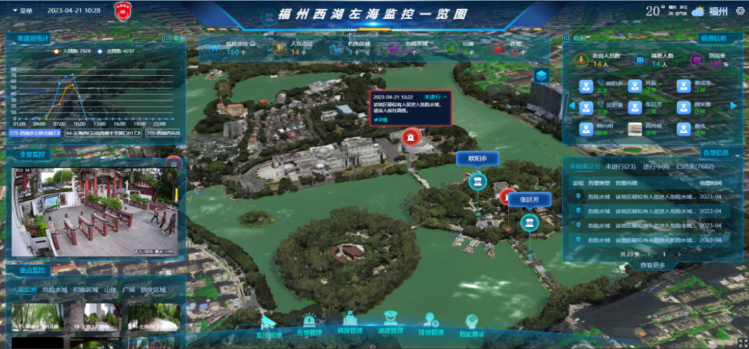 该系统目前应用于福州市西湖公园,通过AI视频监控与大数据智能分析,在智慧安防系统的后台监控界面,可全视角全天候监控园区安全情况,统计游客流量数据,识别游客危险行为,监测水面、山体、园区噪音等情况,在发现潜在安全事件时,平台自行综合调度下发任务,自动调派就近的安保人员进行现场处置。