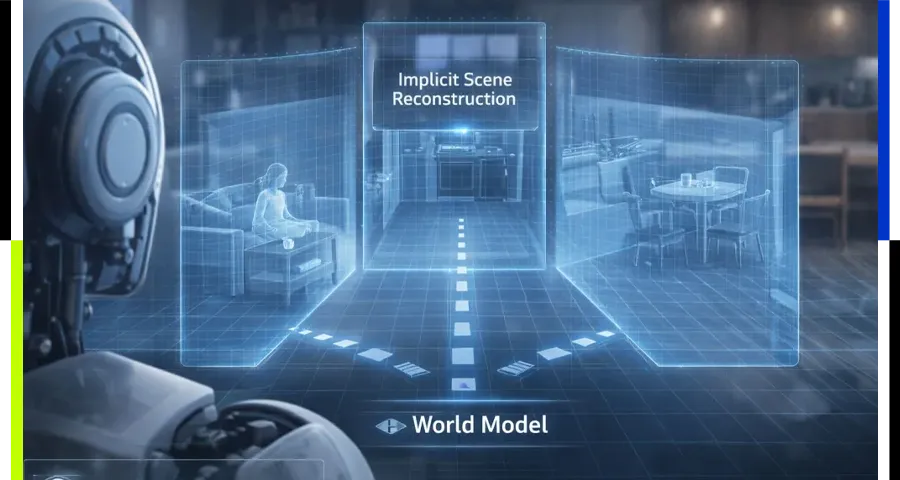 不同于过去依赖显式三维地图构建的传统方案,这类方案的精度高度依赖雷达,且易受反光、透明物体及光照变化干扰;千诀采用因果推理隐式建模,通过单帧图像“幻想”向左、向右、向前行走后可能看到的新场景组件结构特征,能把视觉理解与空间建模融为一体。这一基于世界模型的拟人化范式,有效弥补了传统纯视觉方案信息不充分的短板。