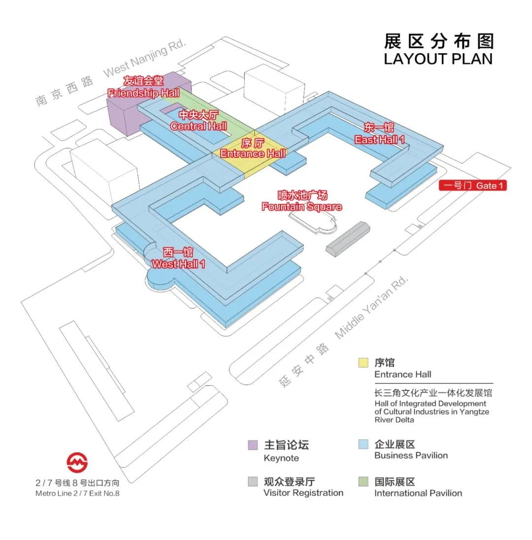 其中序馆为长三角文化产业一体化发展馆,位于中央大厅序厅。企业展区位于中央大厅、东一馆及西一馆,包括:1,新动能-数字内容及新装备展区;2,价值链-出版、媒体和印刷展区;3,新视野-艺术品、设计和时尚展区;4,酷天下-影视、动漫及游戏展区(我们在这里哦★);5,最乐活-演艺、娱乐和体育电竞展区。