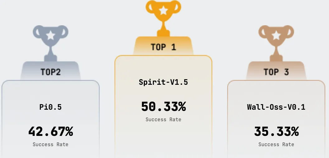 在数据采集层面高阳补充道:“我们通过自研设备将数据采集成本降低了90%,这才有了海量真实世界数据的规模化落地。正是这些技术能力的叠加,让Spirit v1.5成为全球首个性能超越Pi0.5的开源基座具身模型。”