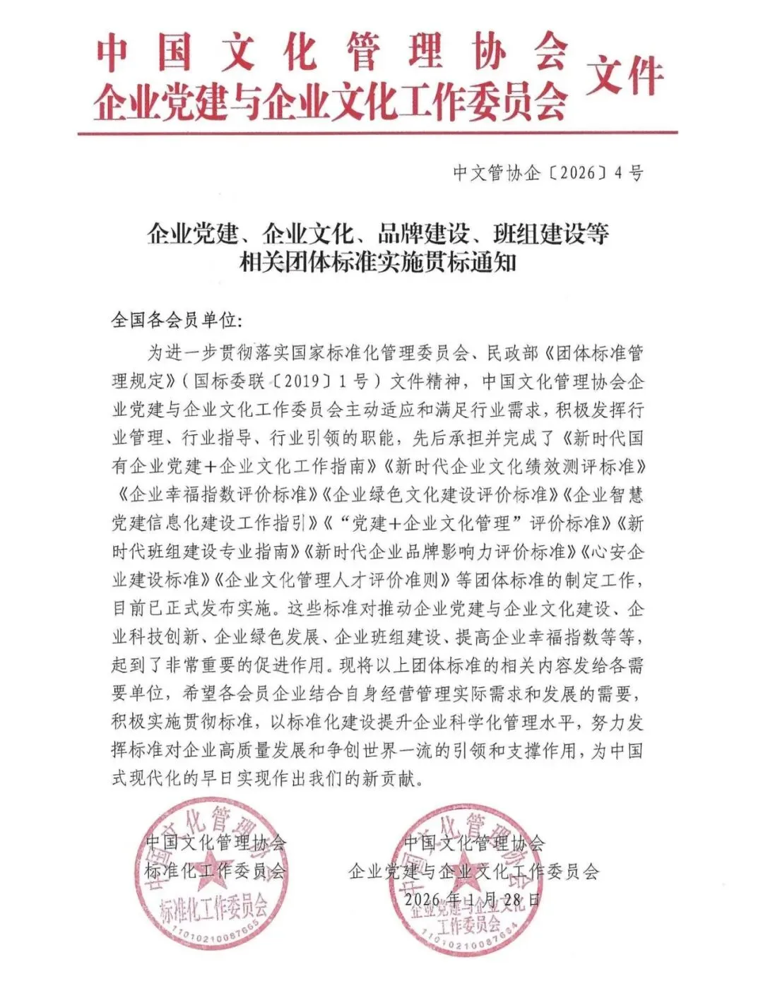 为进一步贯彻落实国家标准化管理委员会、民政部《团体标准管理规定》(国标委联[2019]1号)文件精神,中国文化管理协会企业党建与企业文化工作委员会主动适应和满足行业需求,积极发挥行业管理、行业指导、行业引领的职能,先后承担并完成了《新时代国有企业党建+企业文化工作指南》《新时代企业文化绩效测评标准》《企业幸福指数评价标准》《企业绿色文化建设评价标准》《企业智慧党建信息化建设工作指引》《“党建+企业文化管理”评价标准》《新时代班组建设专业指南》《新时代企业品牌影响力评价标准》《心安企业建设标准》《企业文化管理人才评价准则》等团体标准的制定工作,目前已正式发布实施。