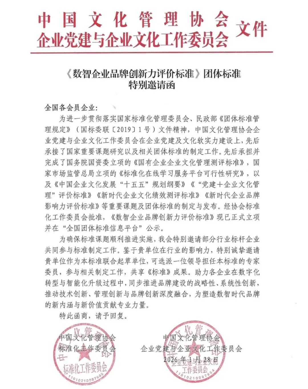 为确保标准课题顺利推进实施,我会特别邀请部分行业标杆企业共同参与标准制定工作。鉴于贵单位在行业的影响力,特别诚挚邀请贵单位作为本标准联合起草单位,可选派一位领导担任本标准的专家委员,参与相关制定工作,共享《标准》成果。助力各企业在数字化转型与智能化升级过程中,同步推进品牌建设的战略性、系统性创新,推动技术创新、管理创新与品牌创新深度融合,为塑造数智时代品牌的新内涵与新价值贡献专业力量。