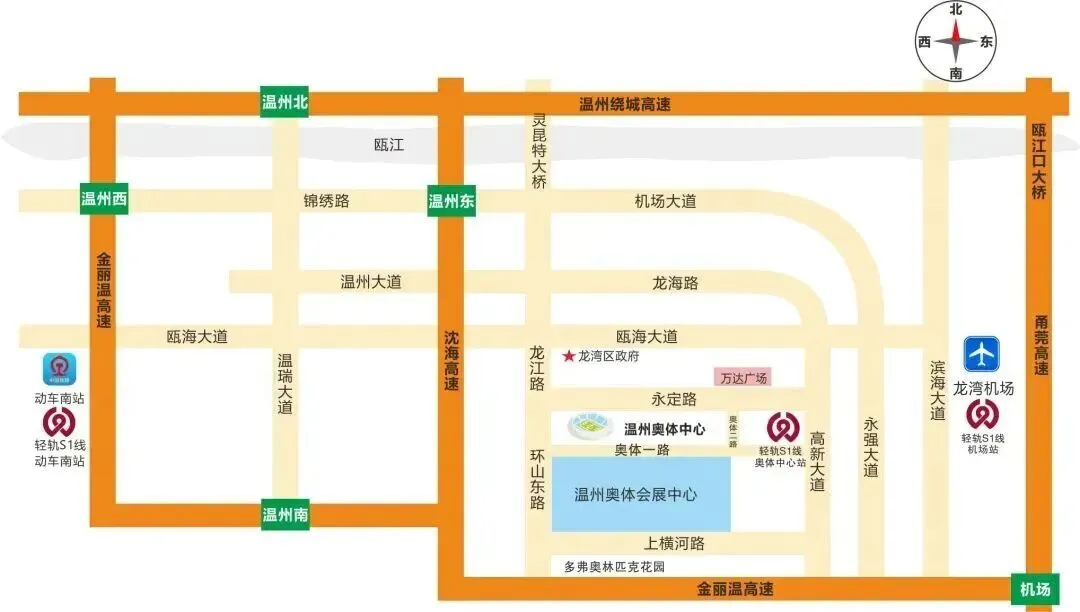 温州市区一瓯海大道高架一龙湾区府路口下高架一龙江路一永定路,奥体中心停车后步行3分钟抵达展馆