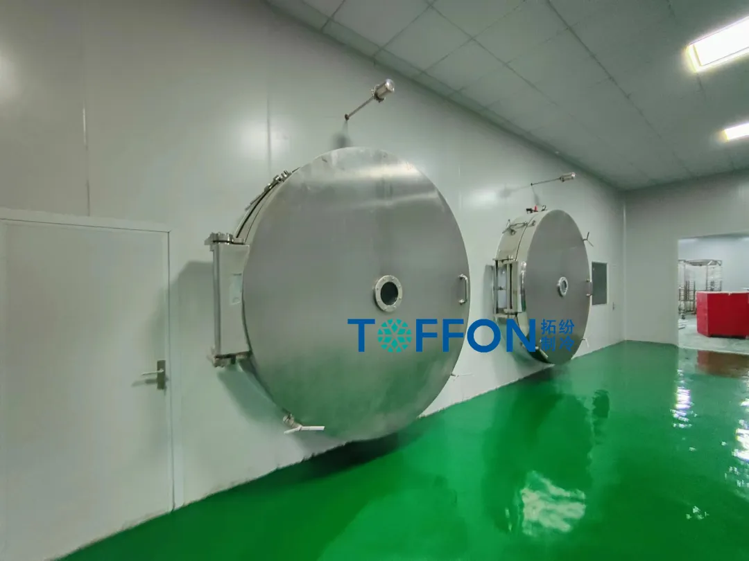 一套完整的冷冻干燥机生产线解决方案,从前端原料处理到冷冻干燥机到后端成品包装的工艺、技术与管理工程。我们会根据客户的产量目标来匹配不同型号冷冻干燥机。我们的生产型冷冻干燥机隔板有效面积(从5平方米至200平方米),其单批次处理原料量可从50公斤到2000公斤不等。例如,若需要日处理3吨汤,可通过组合一台200平方米和一台100平方米的冻干机实现模块化扩产。