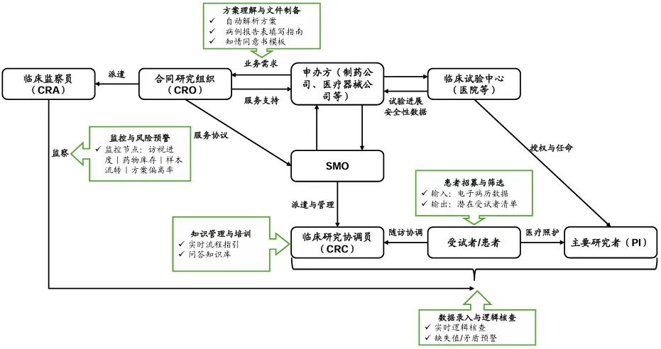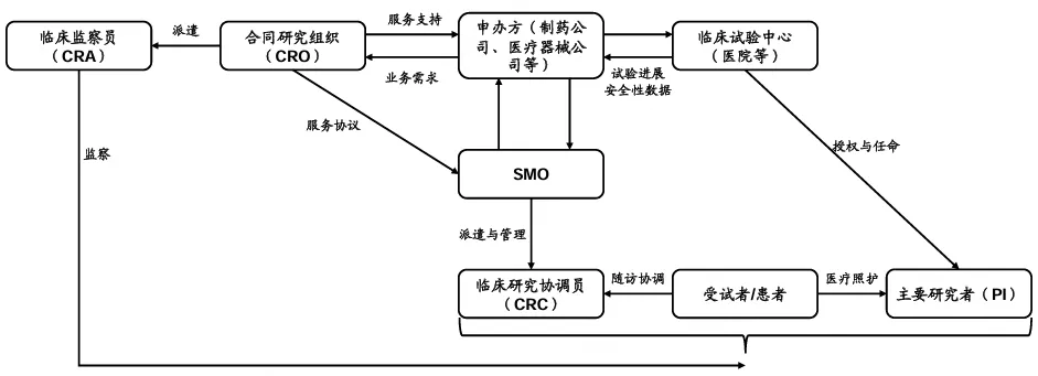 SMO负责临床研究中除医学判断以外的所有事务的管理,通过专业化团队和标准化操作,协助研究者在医疗机构(试验现场)高效推进临床试验。普蕊斯组建了一支由资深项目经理(PM)和临床研究协调员(CRC)构成的专业项目团队,确保临床试验过程符合GCP和研究方案制定。公司作为申办方(如制药公司、医疗器械公司等)、临床试验机构(如医院)、研究者(如医生)、CRO之间的专业桥梁,提供临床试验执行方案,包括大数据建模、前期准备工作、试验点启动、现场执行、项目全流程管理等,确保临床项目的执行与落地。