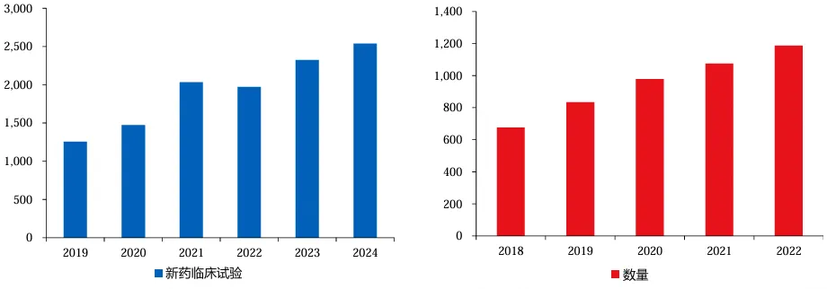 临床试验量获繁荣增长,驱动SMO行业持续扩容。近年来中国临床试验登记数量保持强劲增长势头,尤其是创新药临床试验占比显著提升,以肿瘤、自身免疫、代谢性疾病等前沿领域为代表的复杂试验方案日益增多,从而直接扩大了SMO服务的需求总量。根据国家药监局药品审评中心(CDE)的数据,2024年中国药物临床试验年度登记总量为4900项(以CTR计),较2023年的4300项增长13.9%,其中新药临床试验2024年为2539项。临床试验基础设施亦为临床试验提供有力支撑,数量呈现持续增长态势。截至2022年,全国临床机构数量已达1186家,为试验需求提供落地基础。