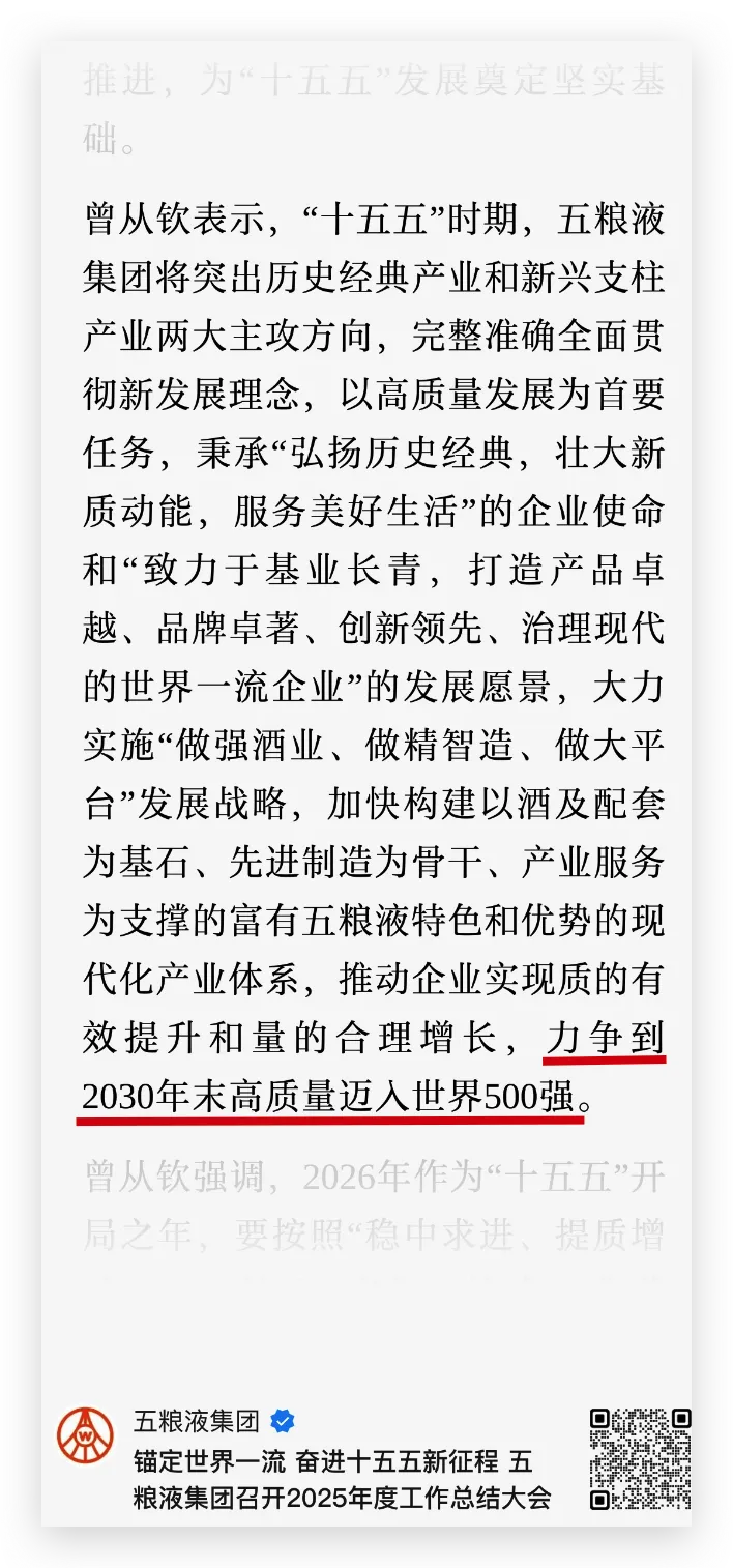 在曾董谈话中,提到做强酒业,排名第一,五粮液的营收增长,对集团十五五目标达成的影响举足轻重,2024年五粮液上市公司营收占集团营收比例为45.7%。查阅资料,2024年五粮液集团公布营收1952.97亿元;同年度上市公司五粮液营收为891.75亿元,据此计算得到上市公司营收占集团营收的比例为45.7%。