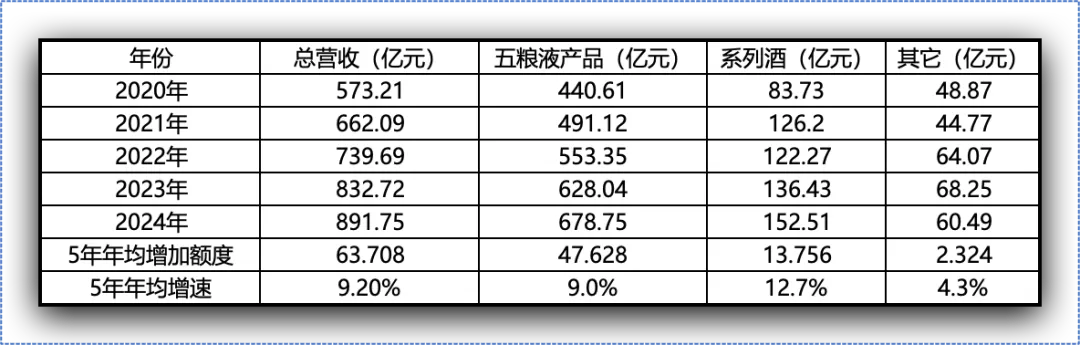 五粮液产品销售额是五粮液营收绝对主力,营收占比77%,年均贡献63.7亿,决定着五粮液十五五期间能否实现双位数增长,只要五粮液产品实现增长,系列酒和其它也会相应地增长,因此,分析五粮液产品的增长情况就足矣。