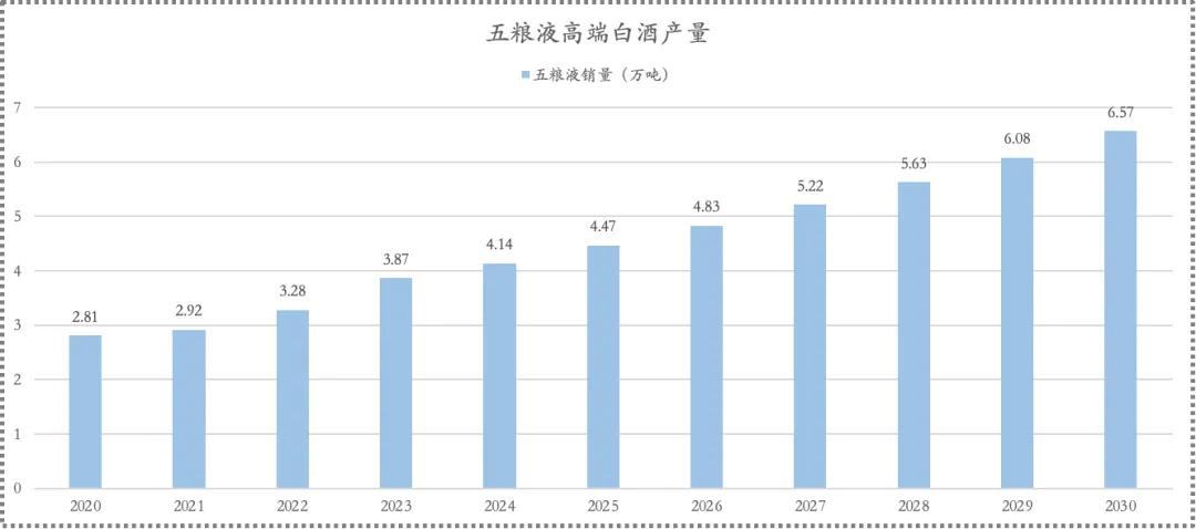 五粮液基酒原酒封存三年后上市,那么到2030年可供销售的五粮液产品的量有6.78万吨,因为,2027年的基酒产能5.22万吨,按1:1.3比例勾兑计算得到2030年的销量。