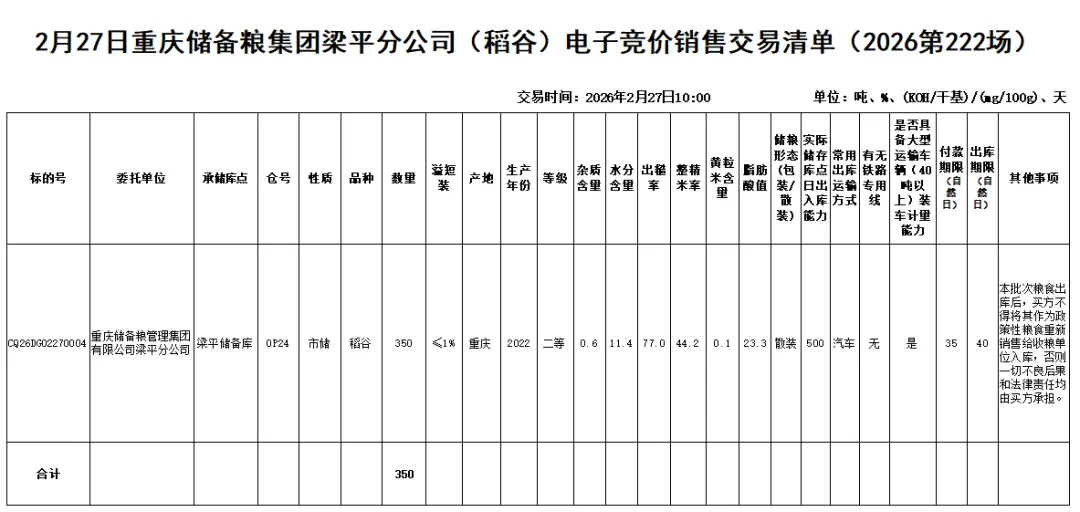 受重庆储备粮管理集团有限公司梁平分公司委托,重庆市粮油批发市场有限责任公司(即国家粮食重庆交易中心,以下简称“批发市场公司”),定于2026年2月27日10:00举办重庆储备粮集团梁平分公司(稻谷)电子竞价销售交易会,现将有关事项公告如下: