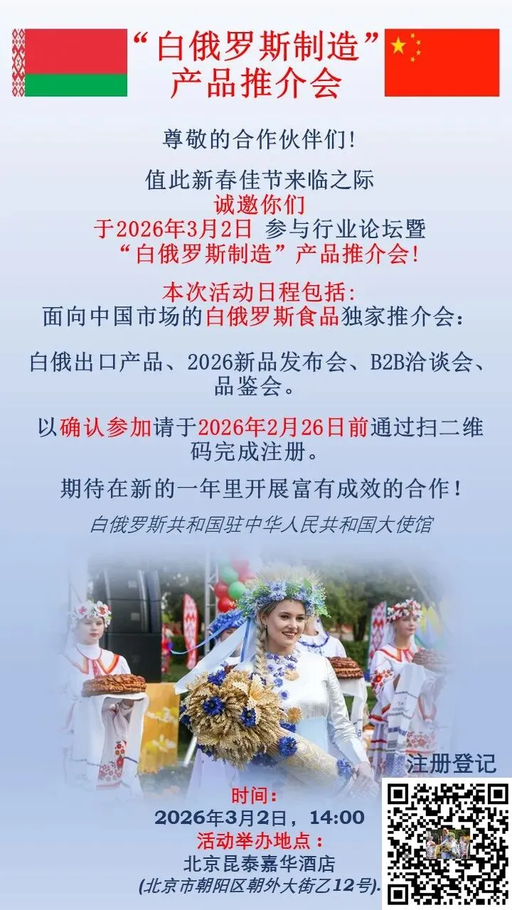 为搭建中白食品贸易合作桥梁,助力中白食品农产品贸易发展,受白俄罗斯驻华使馆委托,现诚邀各相关企业参加“白俄罗斯制造”产品推介会,具体事宜通知如下:
