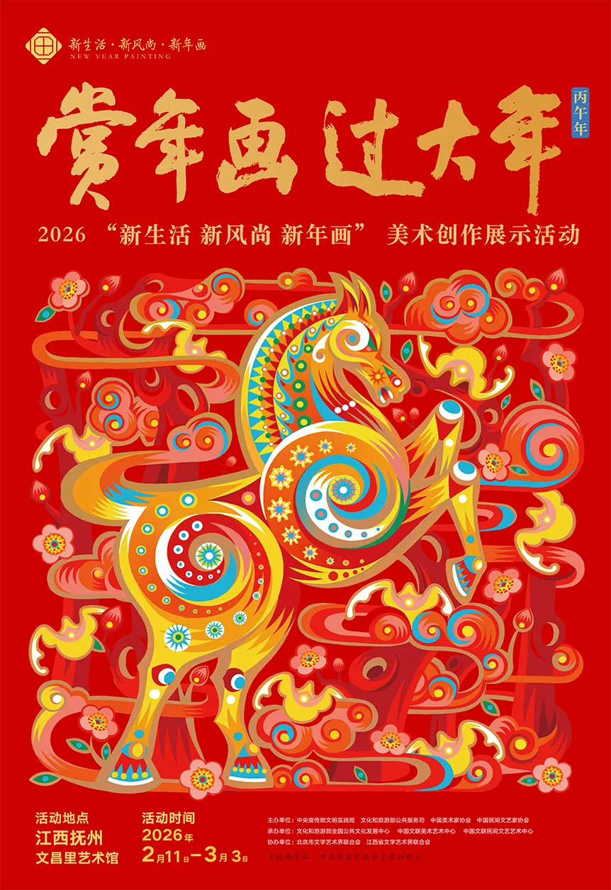 为深入学习贯彻党的二十届四中全会精神,传承弘扬中华优秀传统文化,丰富人民群众节日精神文化生活,激励广大群众振奋精气神、共创新生活,中央宣传部文明实践局、文化和旅游部公共服务司、中国美术家协会、中国民间文艺家协会联合举办了2026年“新生活·新风尚·新年画”美术创作展示活动。本次线上展览的作品,就是其中的精品佳作。它们色彩浓艳鲜明,手法精湛细腻,内容丰富,题材多样,既有传统祈福寓意,又焕发时代活力,呈现出欣欣向荣的多彩画卷和奋发有为的精神面貌,为新春佳节增添浓郁的文化气息与独特的艺术光彩。