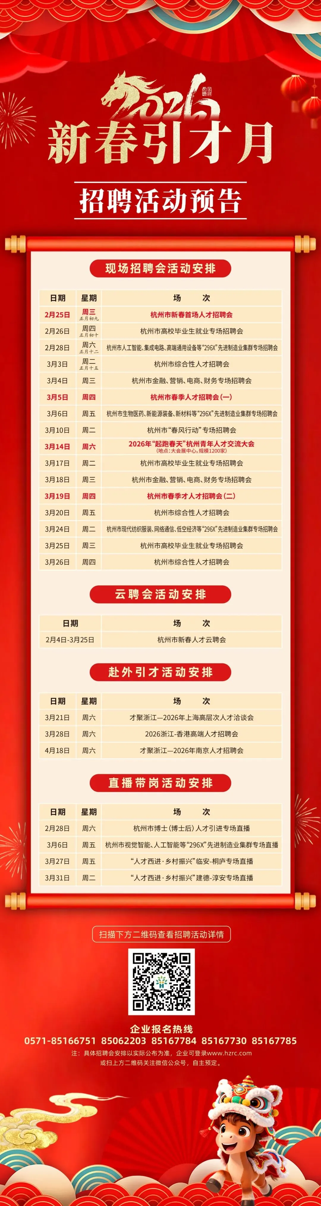 好消息!杭州招聘会全面来袭。2月25日至3月31日,持续多场。其中,2026年“起跑春天”杭州青年人才交流大会将于3月14日在杭州大会展中心举办,具体岗位可登录杭州人才网(www.hzrc.com)抢先看,有需求的千万别错过!