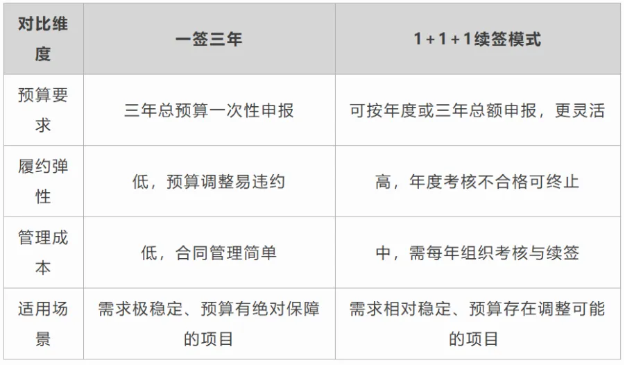 核心操作:招标时明确三年总预算、服务标准和价格机制,一次性签订三年期固定合同,约定分年度支付款项、分阶段开展履约考核。