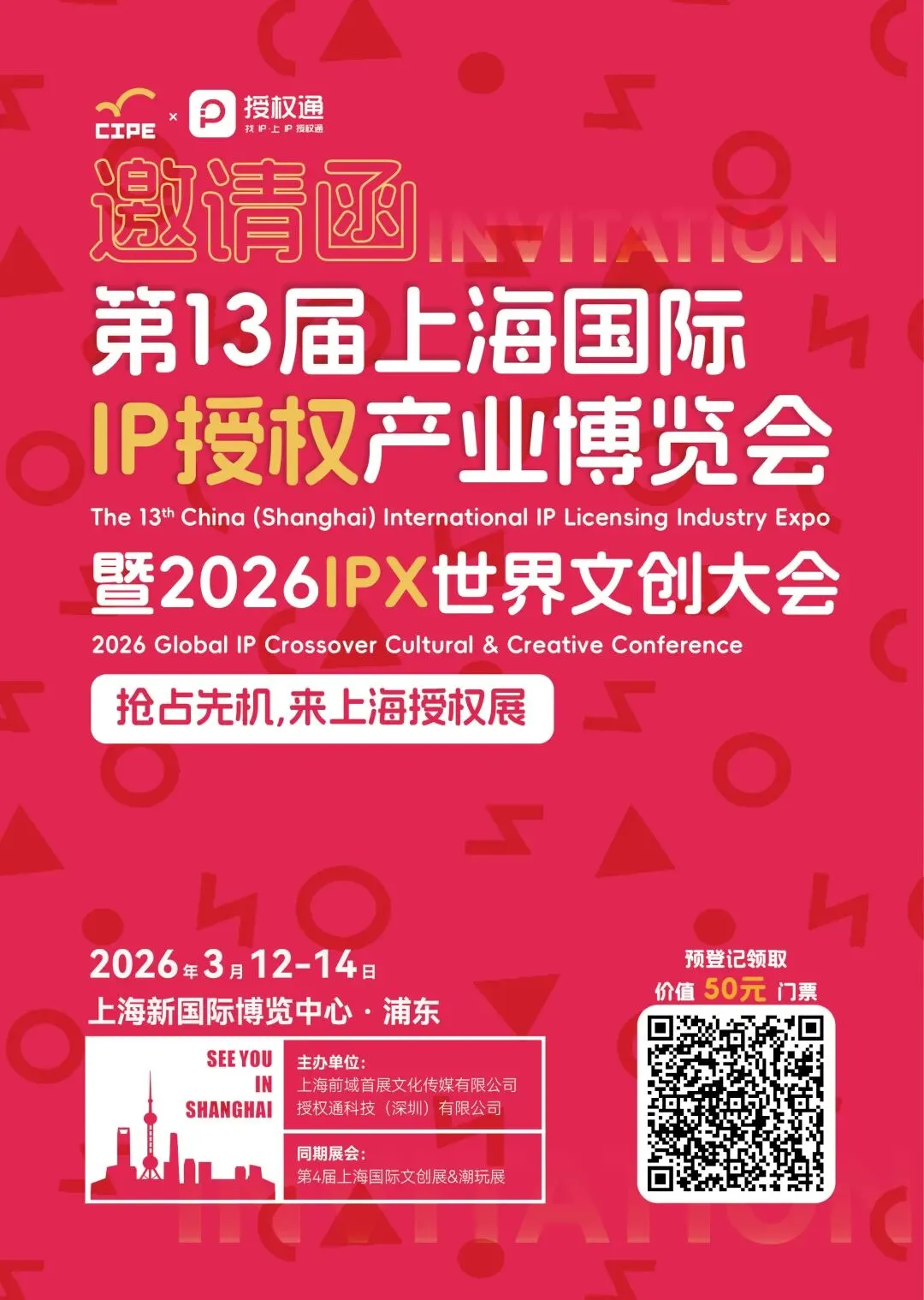 开工启航,不负春光!2026年3月12日至14日,第13届上海国际IP授权产业博览会暨IPX世界文创大会将在上海新国际博览中心·浦东举办。展会期间同期举办第九届玉猴奖颁奖、2026 IP授权通·上海对接会、IPX文创潮玩内销新渠道论坛、IPX文创潮玩出海论坛、AI玩具千人大会、IP授权大会、IPX城市文创文旅发展大会等多个论坛及活动,看IP如何与玩具、服饰、3c电子、文旅、食品、科技、美妆等各行各业碰撞出火花,打开IP商业化的新思路。诚邀IP版权方、被授权方、渠道商、制造商和零售商等业界人士亲临现场进行合作洽谈,携手共赢!长按识别下方二维码或点击文末“阅读原文”预约观展,把握行业发展先机。