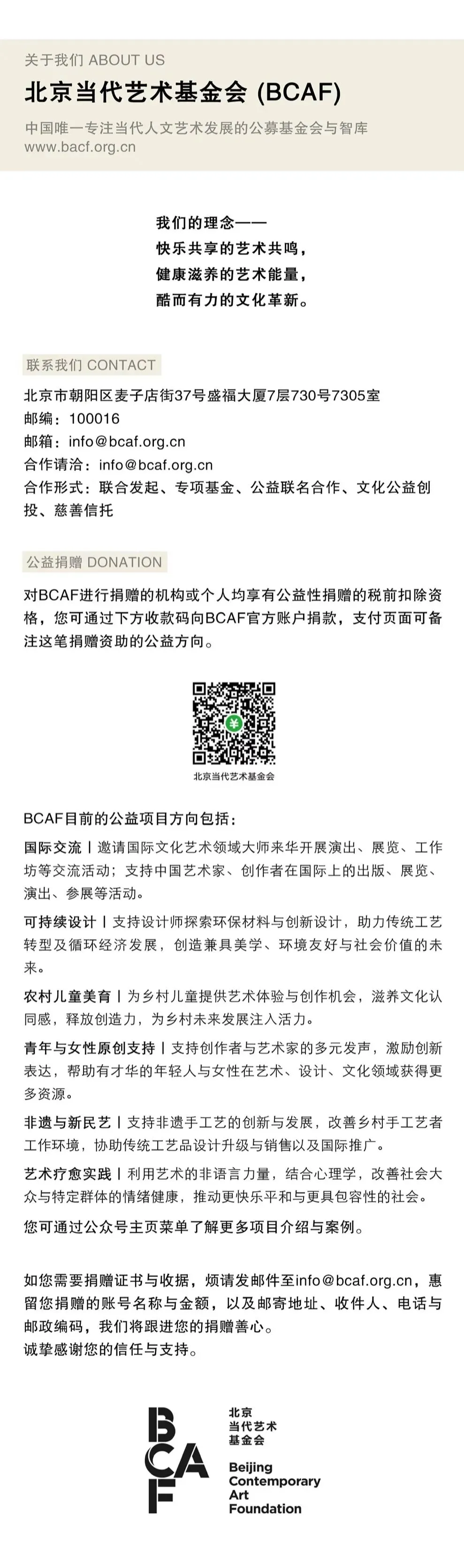 中国唯一专注于当代人文艺术发展的独立性公募基金会和文化智库。以“让更多人自由平等地分享文化艺术,构建多元化的人文公民社会”为战略使命,在文化创新、艺术公益、智库研究、国际交流四大领域与来自全球19个国家的专业机构共同开展人文项目。我们尊重独立、多元、自由的民间往来,致力于支持具有全球视野的艺术家和创作者,将中国当代文化推介至国际舞台。