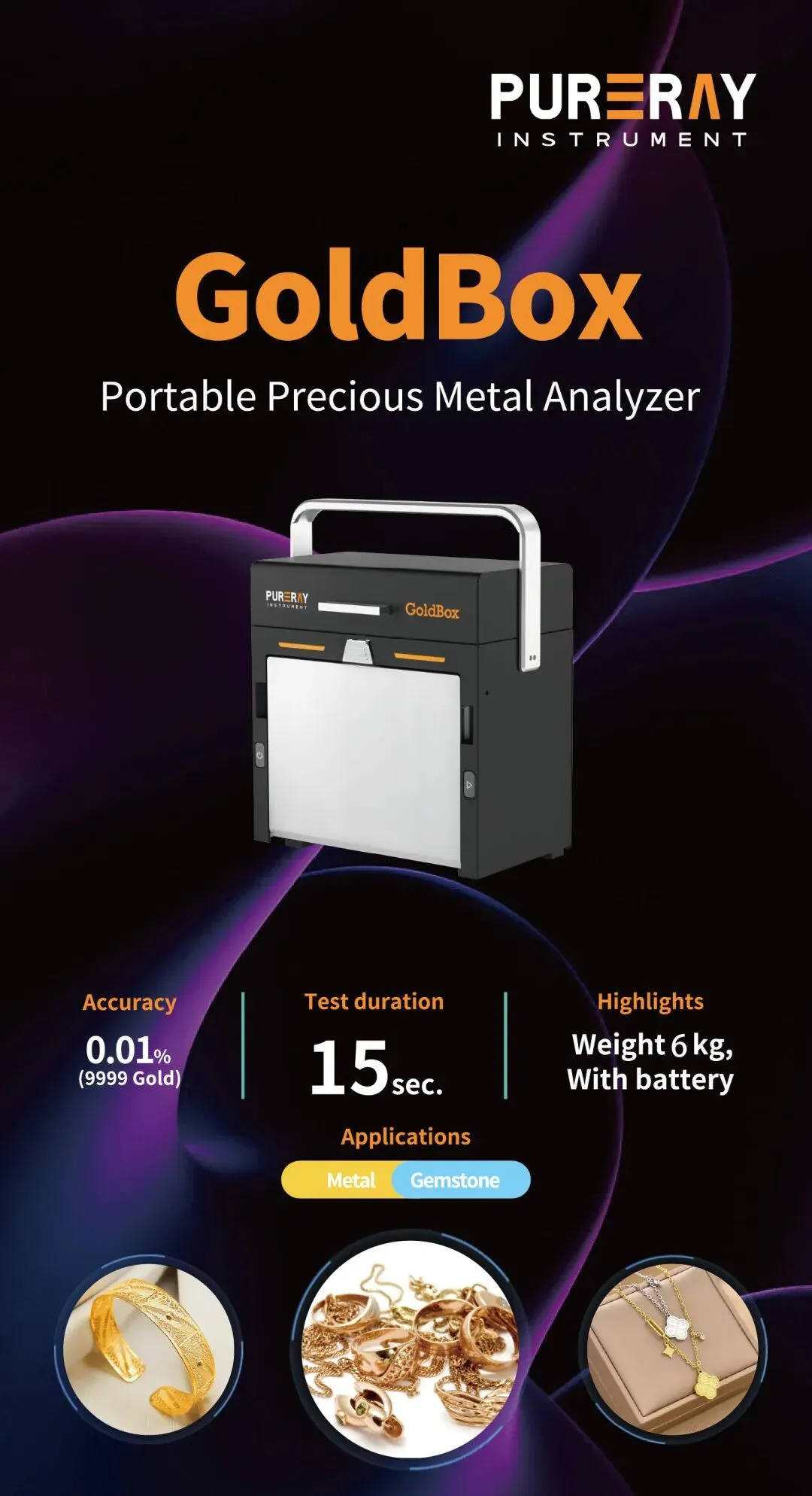 GoldBox便携测金仪,小巧轻便,高精度检测,支持快速无损定性定量分析。搭载AMPTEK定制Fast-SDD探测器与智能算法,数据稳定可靠,适用于贵金属回收、流动检测及多场景应用,实现即开即测、高效便捷。