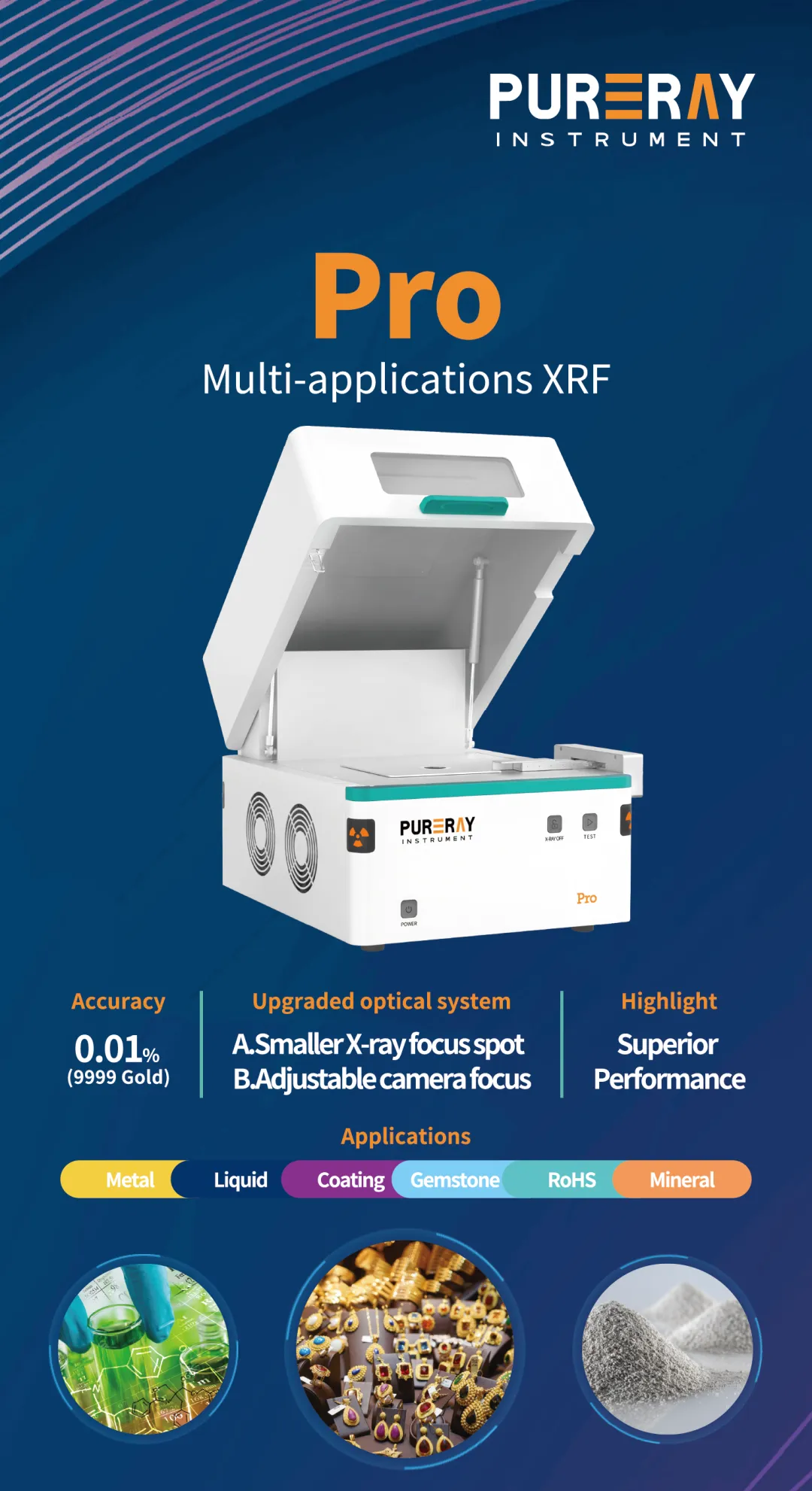 Pro旗舰款多功能X射线荧光光谱仪。采用Smart FP算法及创新型垂直光,支持贵金属成分分析、镀层厚度、电镀液浓度检测、宝石鉴定、矿石粉末分析及RoHS筛查,检测快速稳定,超高精准度。