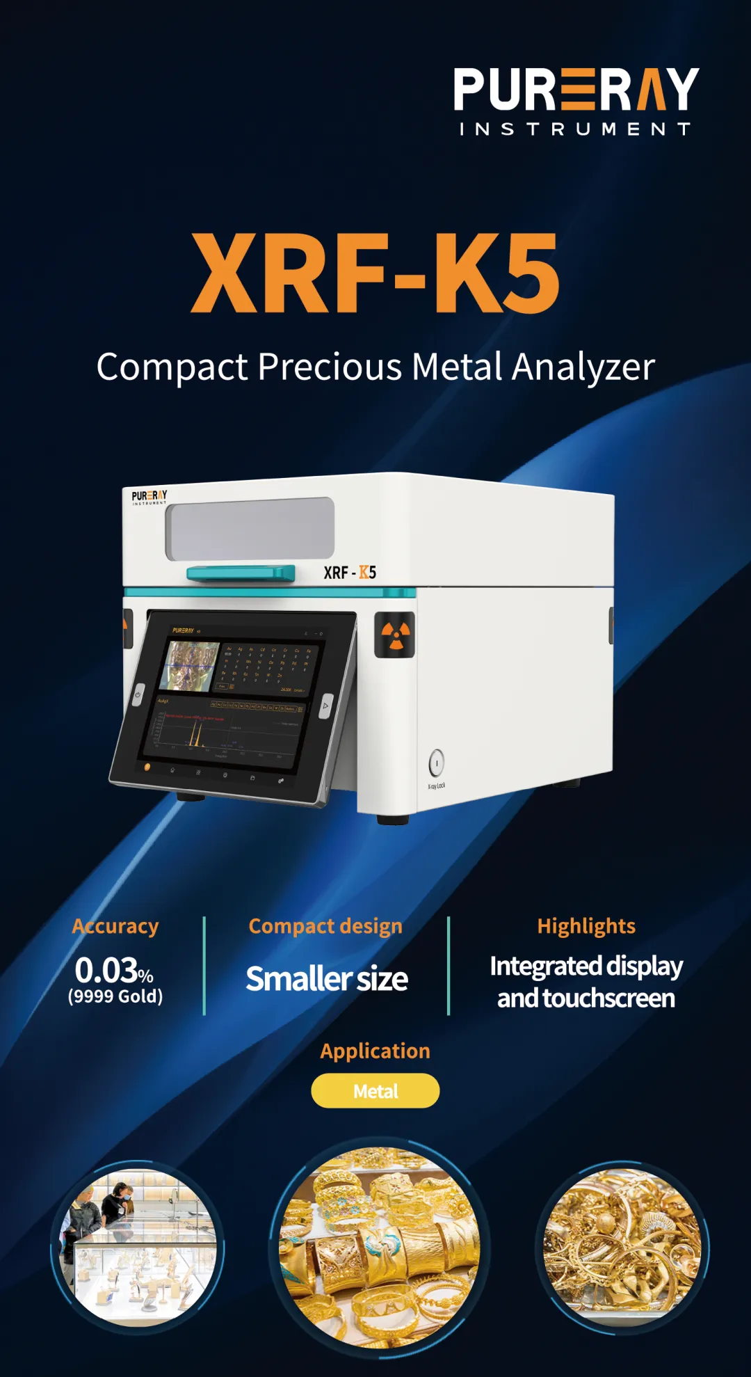 XRF-K5贵金属检测仪,采用一体机设计,支持触屏操作,体积小巧,在海内外市场备受欢迎。该仪器能快速精准分析黄金等贵金属成分,可适用于黄金回收、珠宝首饰工厂、展厅、银行等行业。