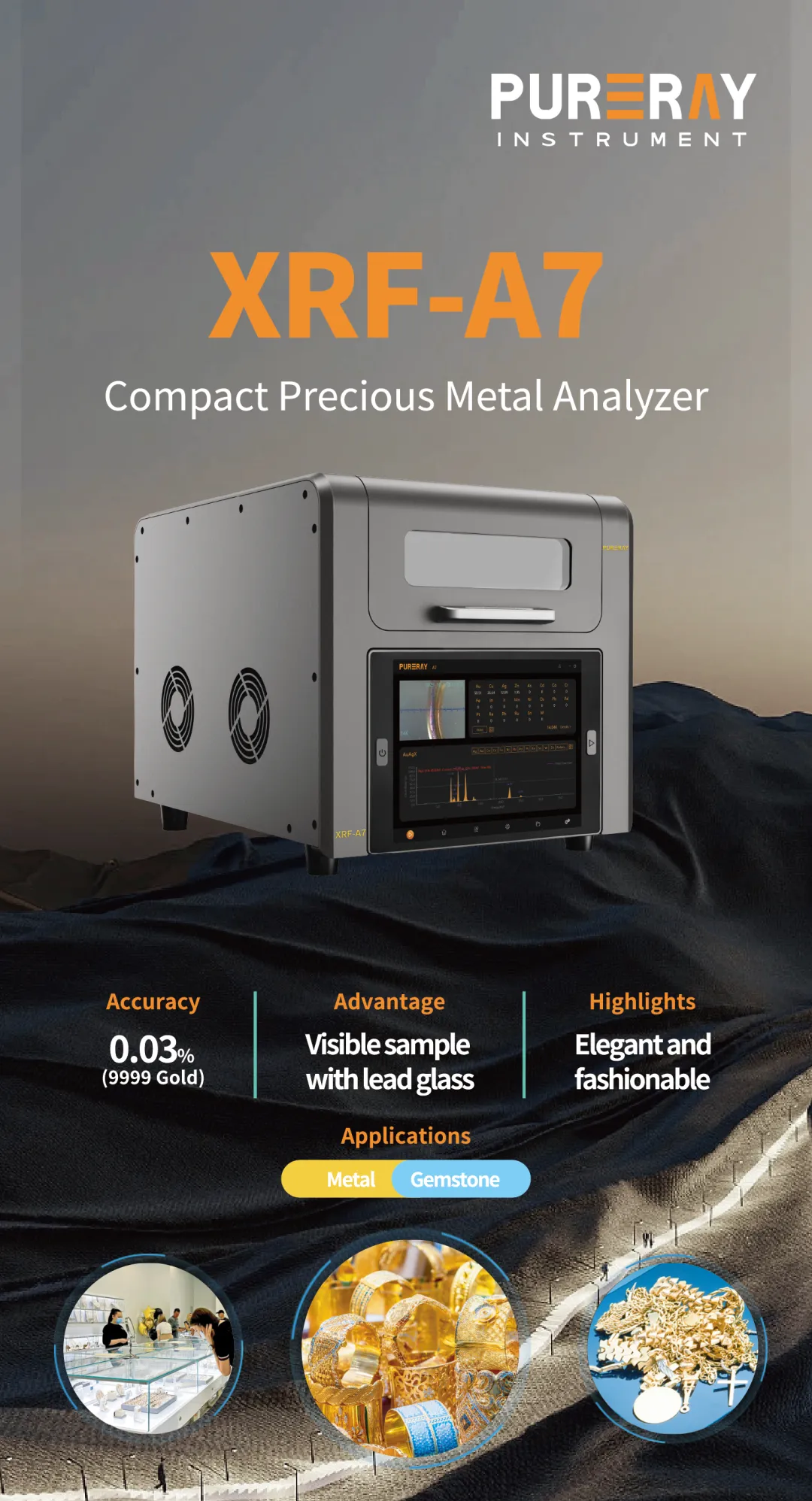 XRF-A7贵金属检测仪,科技美学设计。采用美国AMPTEK定制的Si-PIN探测器。可广泛应用于黄金回收、珠宝工厂、展览厅、银行、质检中心等行业。